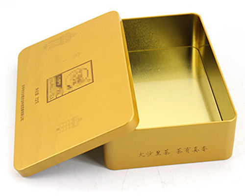 方形通用茶葉鐵罐包裝為單面CMYK四色印刷處理,外過水性亮光油,內涂金油,過油目的不僅能提高鐵盒整體效果,具有強烈的金屬質感外,還對鐵罐印刷面形成一層致密的保護膜,對鐵罐刮花、防銹起到一定的防護作用。除了過光油、透明油外,客戶還可選擇過皺紋油、珠光油、爆炸油等。